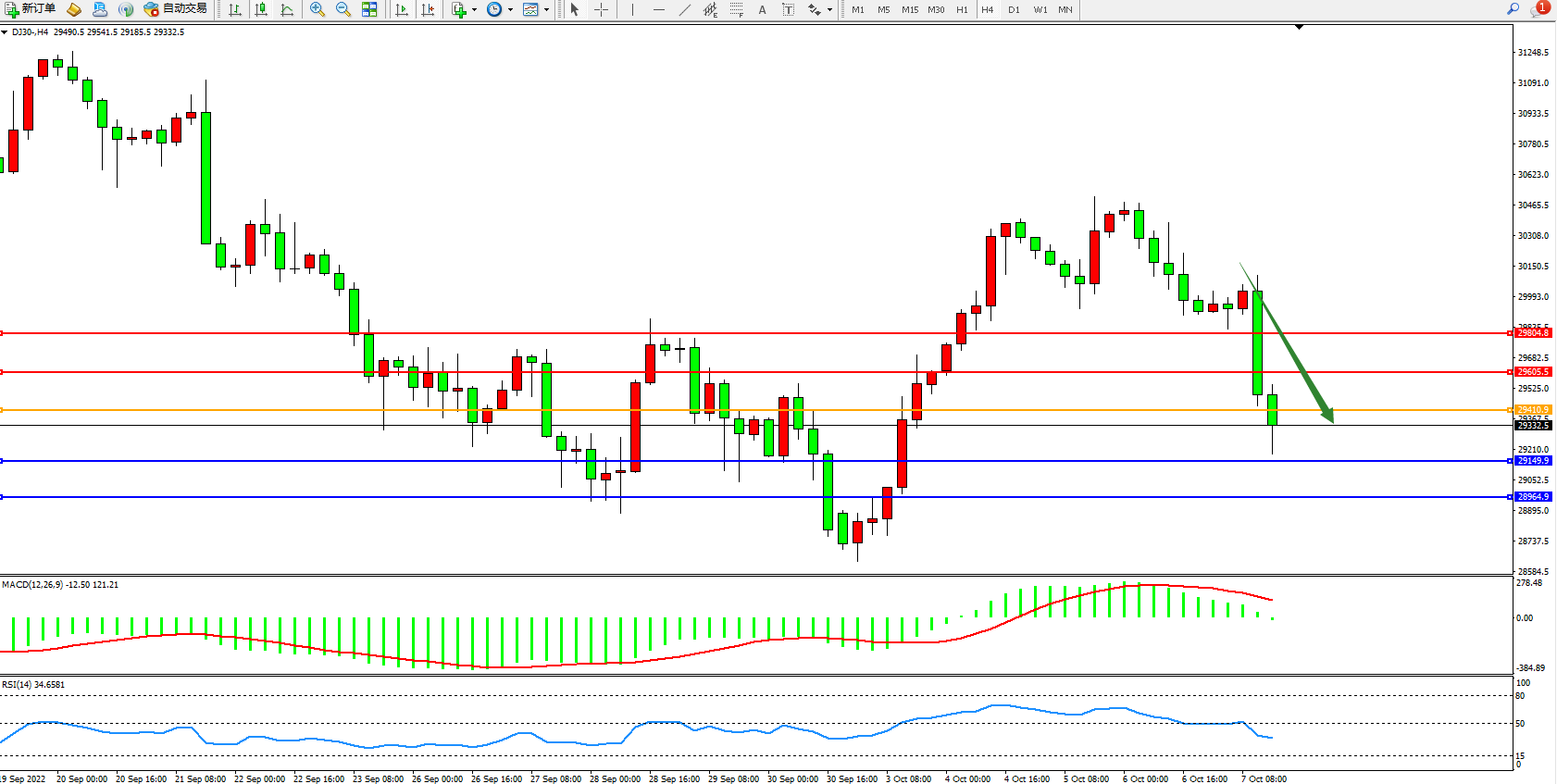 道琼斯指数10月7日(周五)收盘下跌630.08点,跌幅2.11%,报29296.86点;美国9月份失业率意外下降,就业数据略高于预期,表明尽管美联储试图为就业市场降温,但就业市场依然紧张。