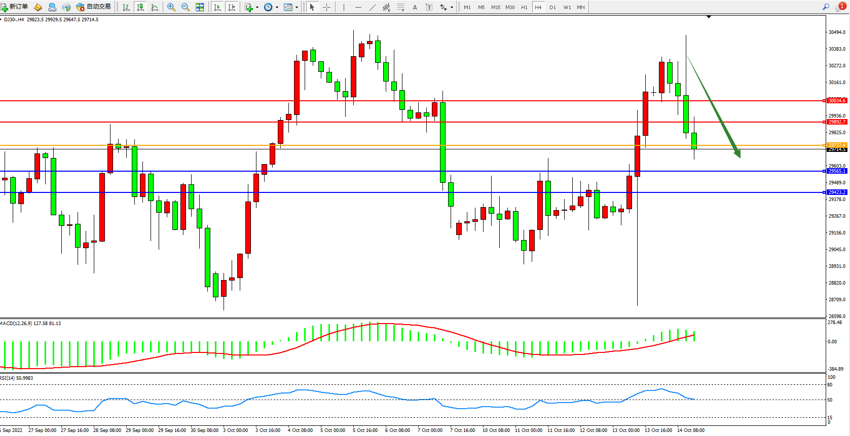 道琼斯指数10月14日(周五)收盘下跌398.88点,跌幅1.33%,报29639.84点;美国上月零售销售表现低迷,这表明在数十年来最严重的通胀环境下,消费者对非必需品的购买变得更加谨慎。