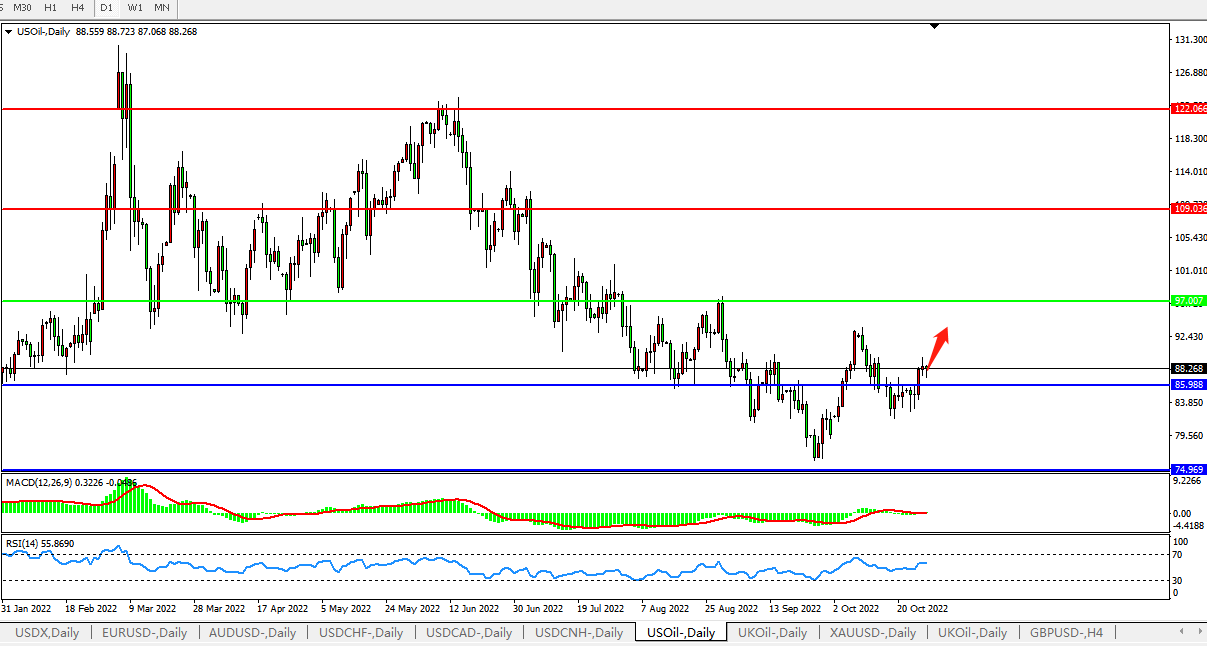 日线图看:油价上攻后整理蓄势, MACD量能柱0轴附近徘徊,RSI指标小幅上行,短期油价延续反弹上攻概率较大。