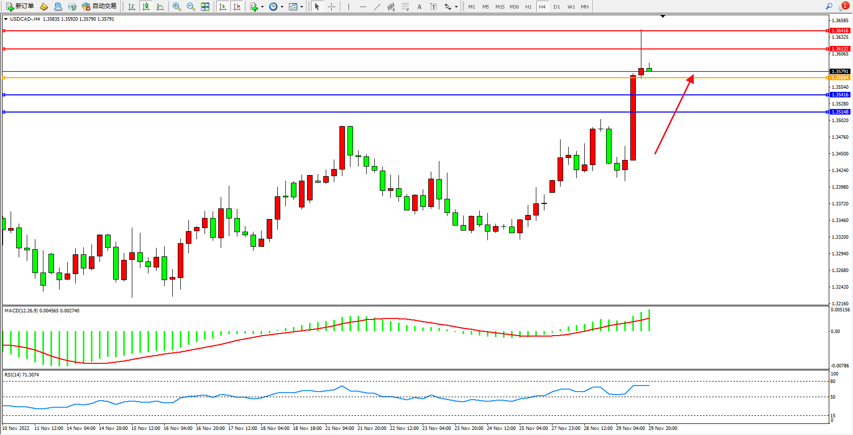 美元加元USDCAD——4小时K线图显示: