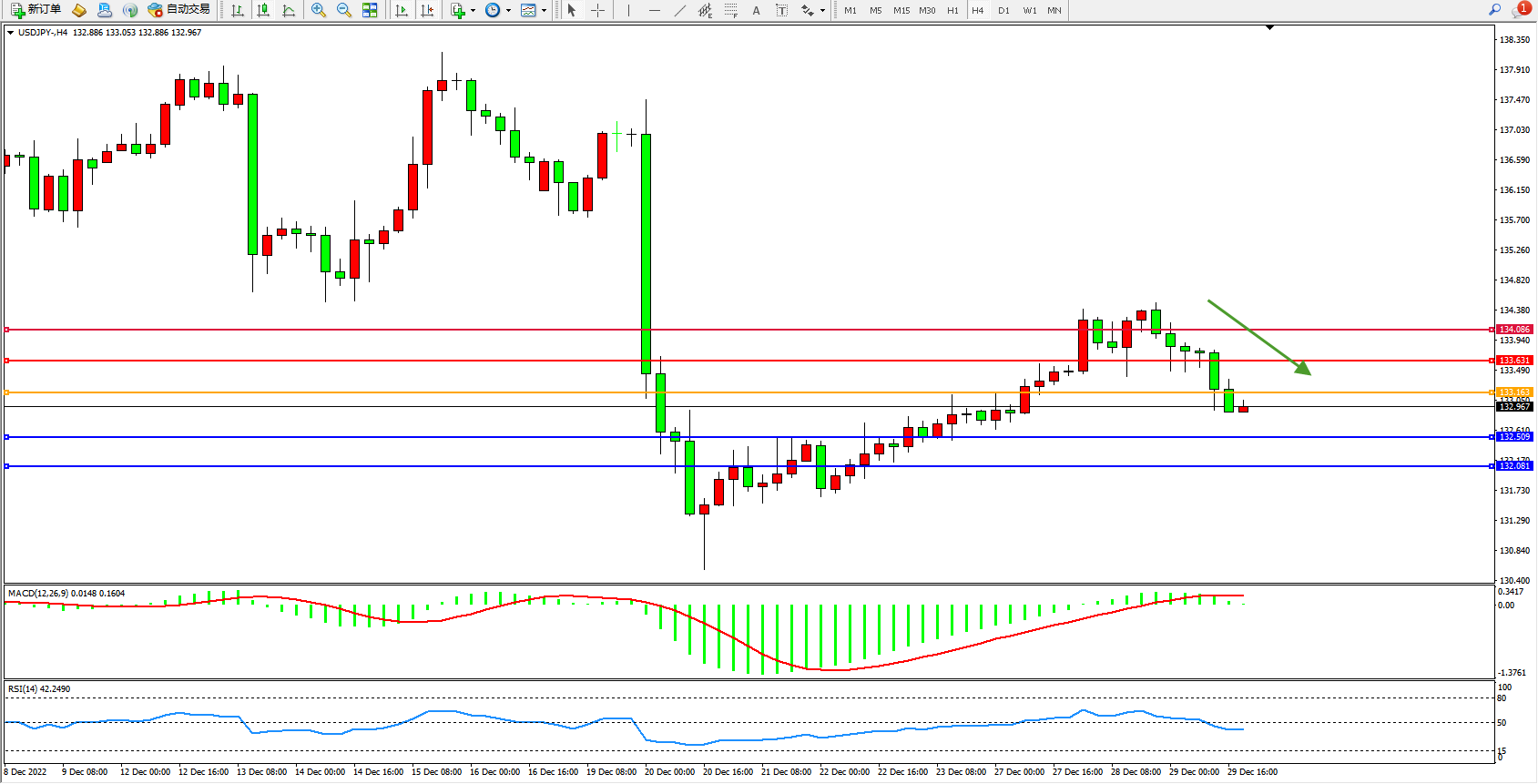 交易策略:133.063下方看跌,目标132.509、132.081