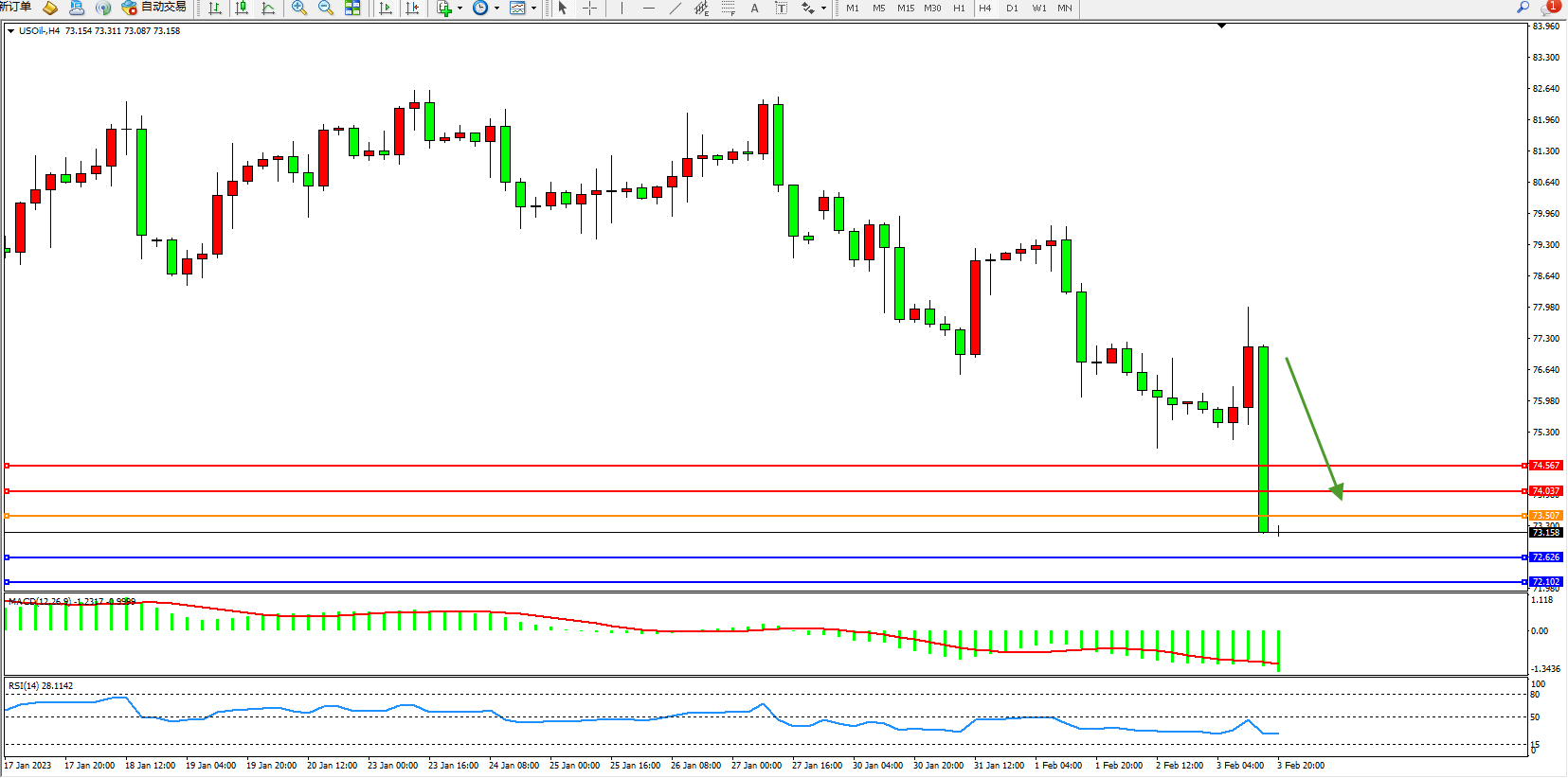 交易策略:73.507下方看跌,目标72.626、72.102