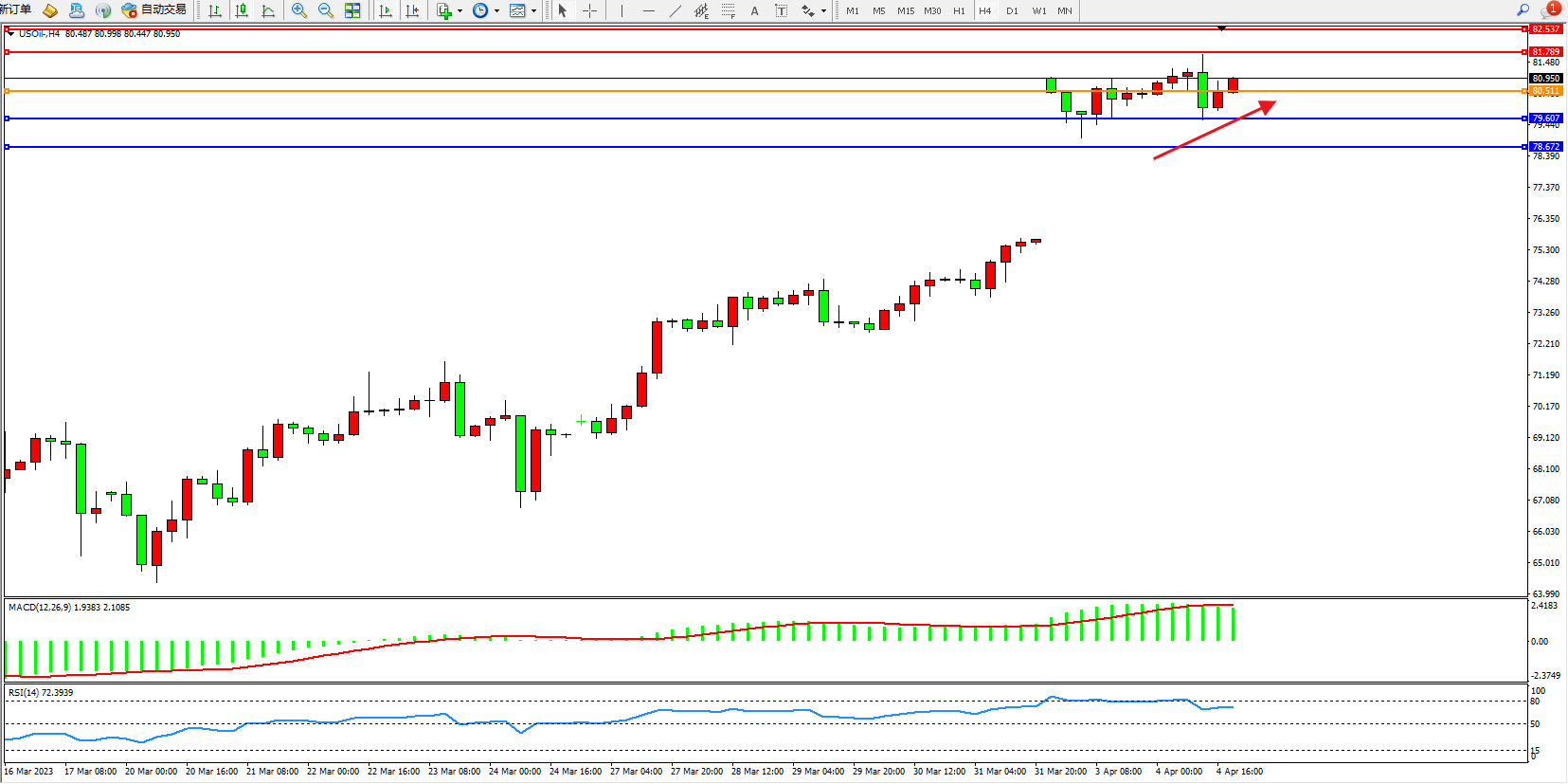 原油USOil——4小时K线图显示: