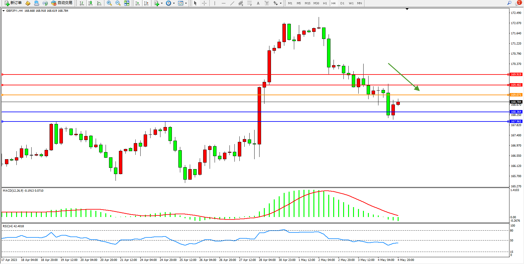 交易策略:169.071下方看跌,目标168.364 167.965