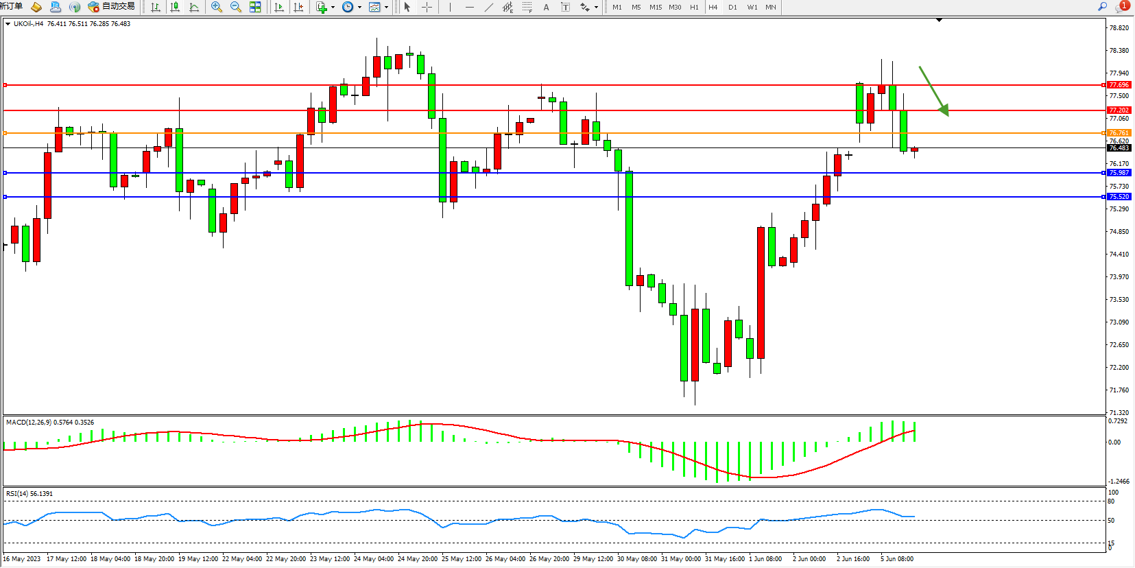 布油维持76.483附近震荡,沙特能源部表示该国7月份产量将从5月份的约1000万桶/日降至900万桶/日。此次减产是该国多年来力度最大的一次。