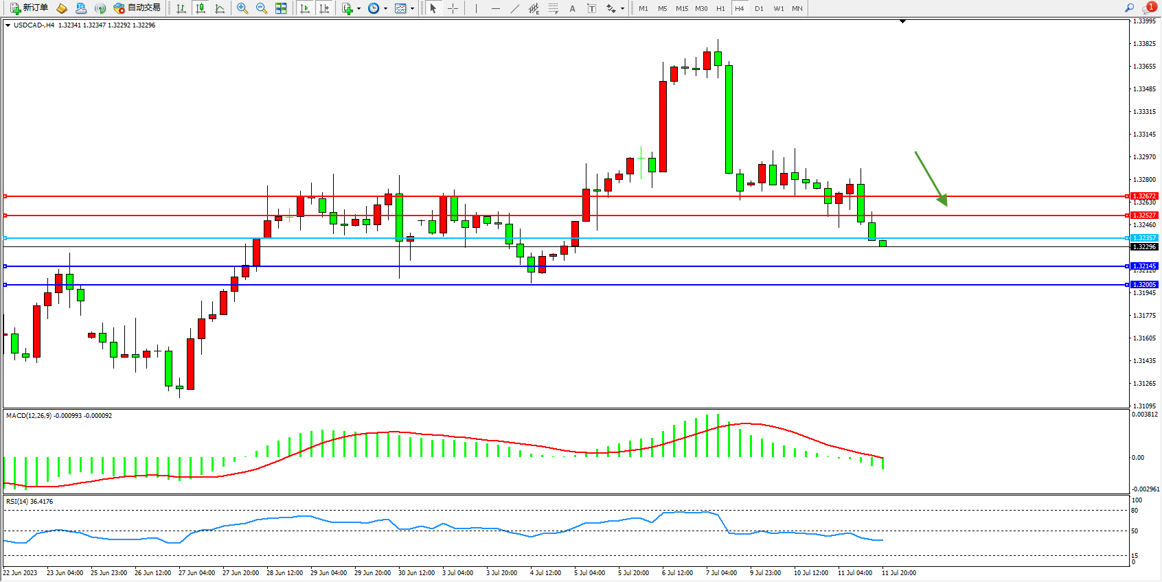 美元加元USDCAD——4小时K线图显示: