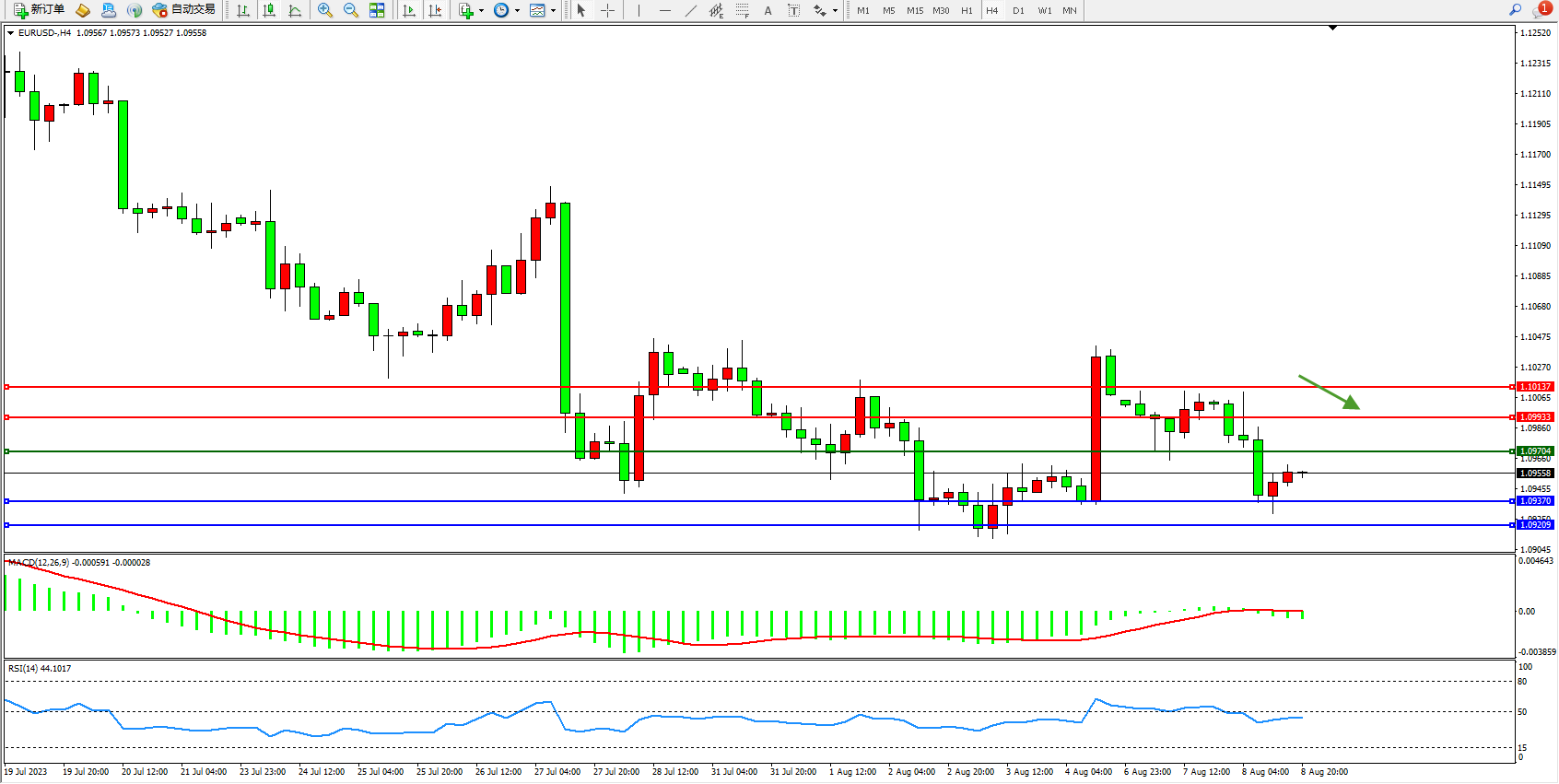 欧元美元EURUSD—4小时K线图显示:
