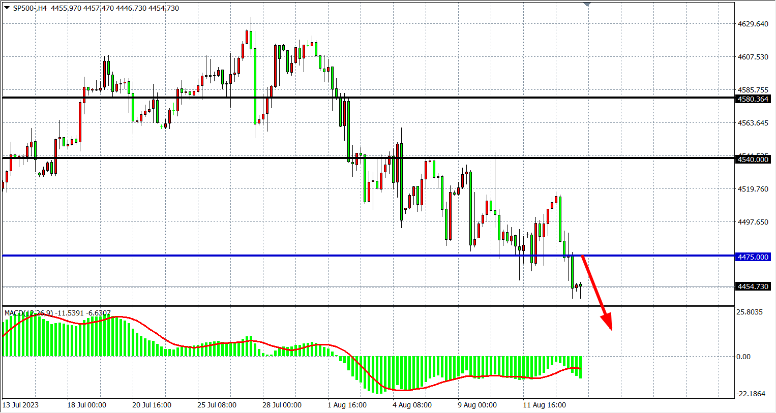 4小时图看,标普进一步跌破4475支撑,MACD量能在零轴下放量,行情走势仍较疲弱,阻力关注4475附近,支撑关注下方4430-4400附近。