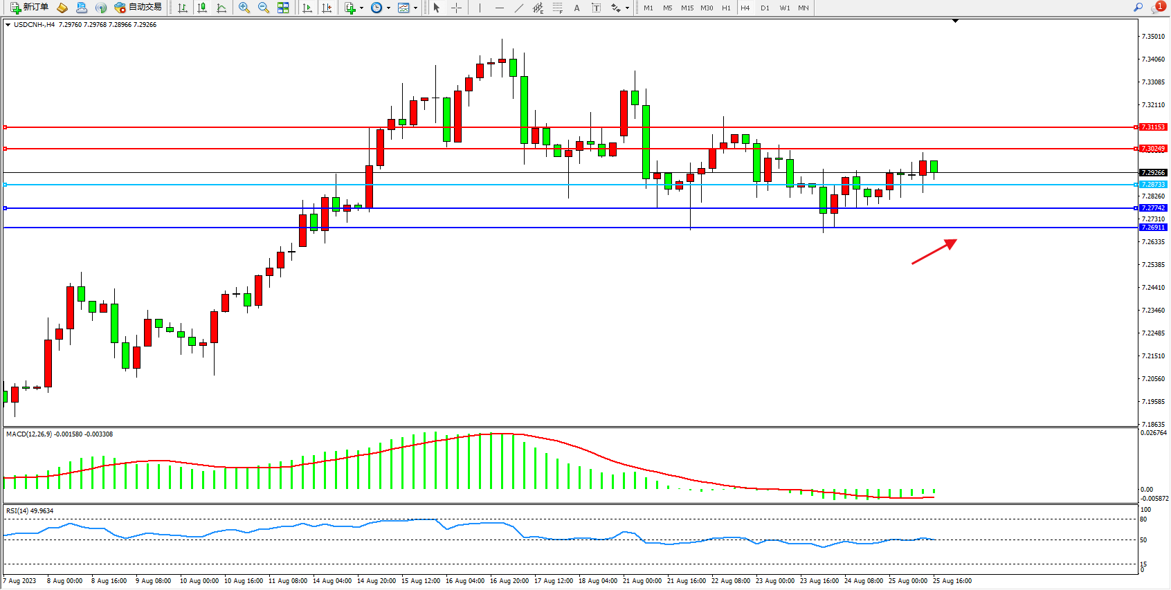 美元人民币USDCNH——4小时K线图显示: