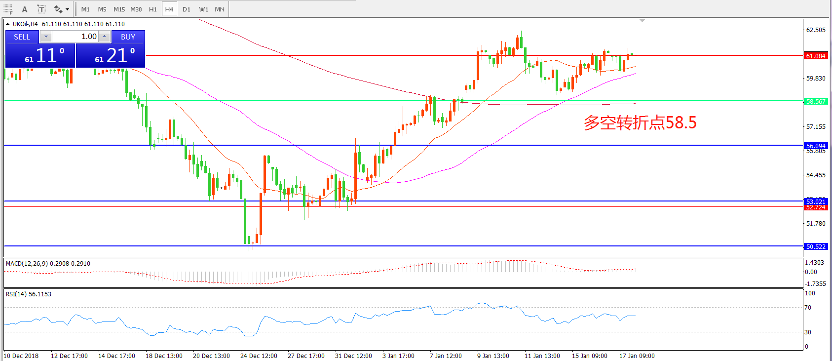 4时图看,油价经过连续整理突破61美元,但短期内依然呈现震荡形态, 均线系统呈多头排列,但MACD红柱缩短,重点关注55周期均线支撑。
