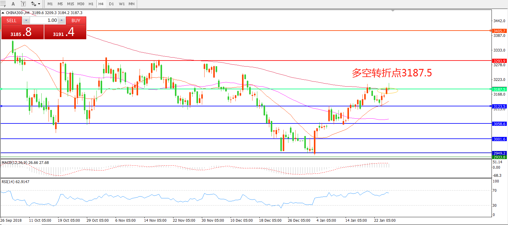 4小时图看,CHINA300中华指数经过连续整理突破并站稳200周期均线,短期均线逐渐拐头, MACD红柱增加,逢低做多为合理选择。
