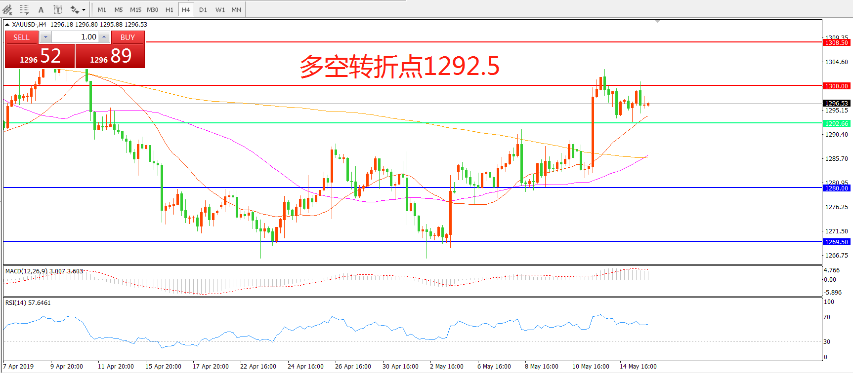 美国总统特朗普淡化近期与中国的贸易摩擦升级,并坚称两国之间的谈判没有破裂。金价于1300附近进行高位整理,贸易紧张情绪有所缓解,这令日内金价走势窄幅波动,暂时缺乏破局动能。同时由于有消息称特朗普政府将推迟实施汽车关税,股市由跌转涨,市场风险情绪回升,但整体来看金价仍处于强势走势之中。