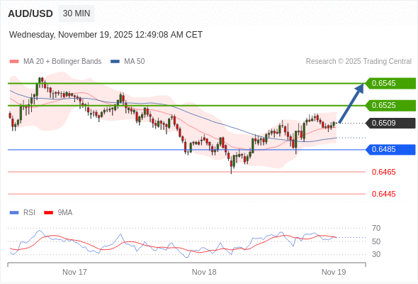 在 0.6485 之上,看涨,目标价位为 0.6525 ,然后为 0.6545 。