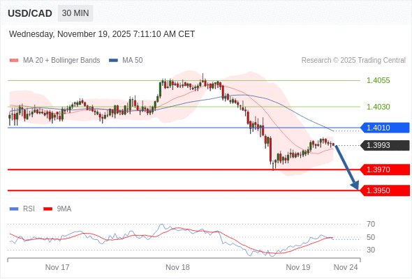 在 1.4010 之下,看跌,目标价位为 1.3970 ,然后为 1.3950 。