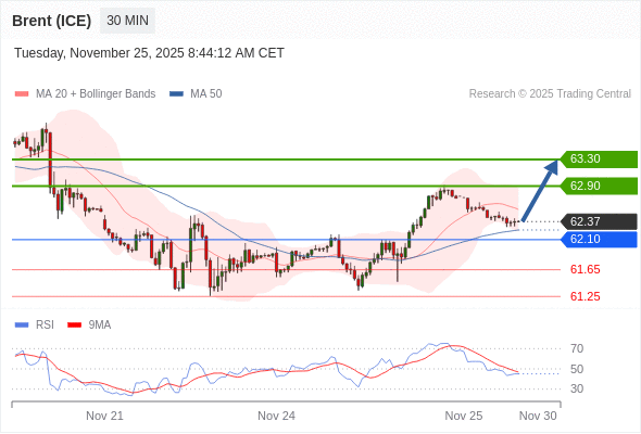 在 62.10 之上,看涨,目标价位为 62.90 ,然后为 63.30 。