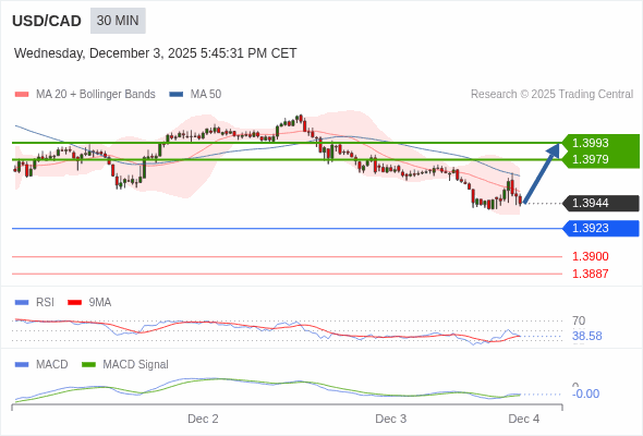 美元/加元 当日内 : 有上涨的可能,目标价位定在 1.3993 。