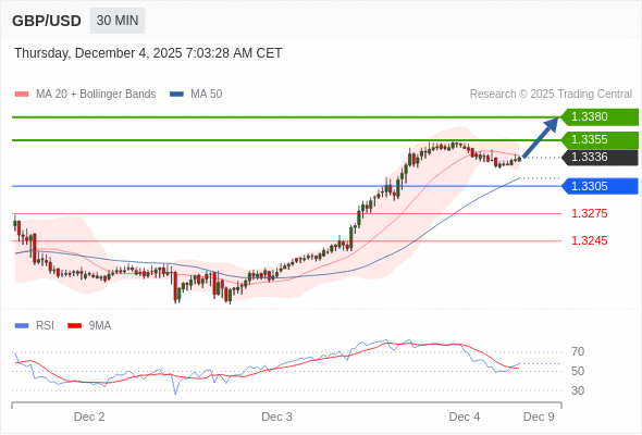 在 1.3305 之上,看涨,目标价位为 1.3355 ,然后为 1.3380 。