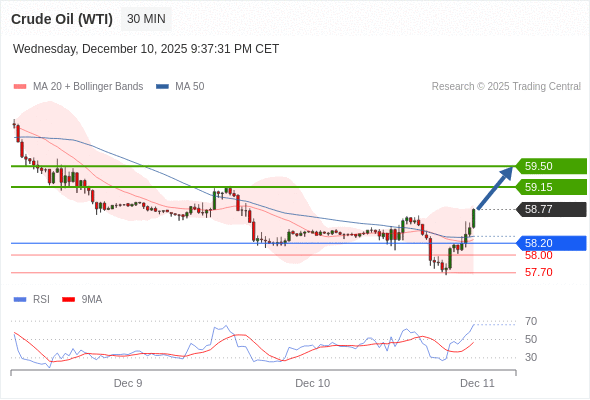 在 58.20 之上,看涨,目标价位为 59.15 ,然后为 59.50 。