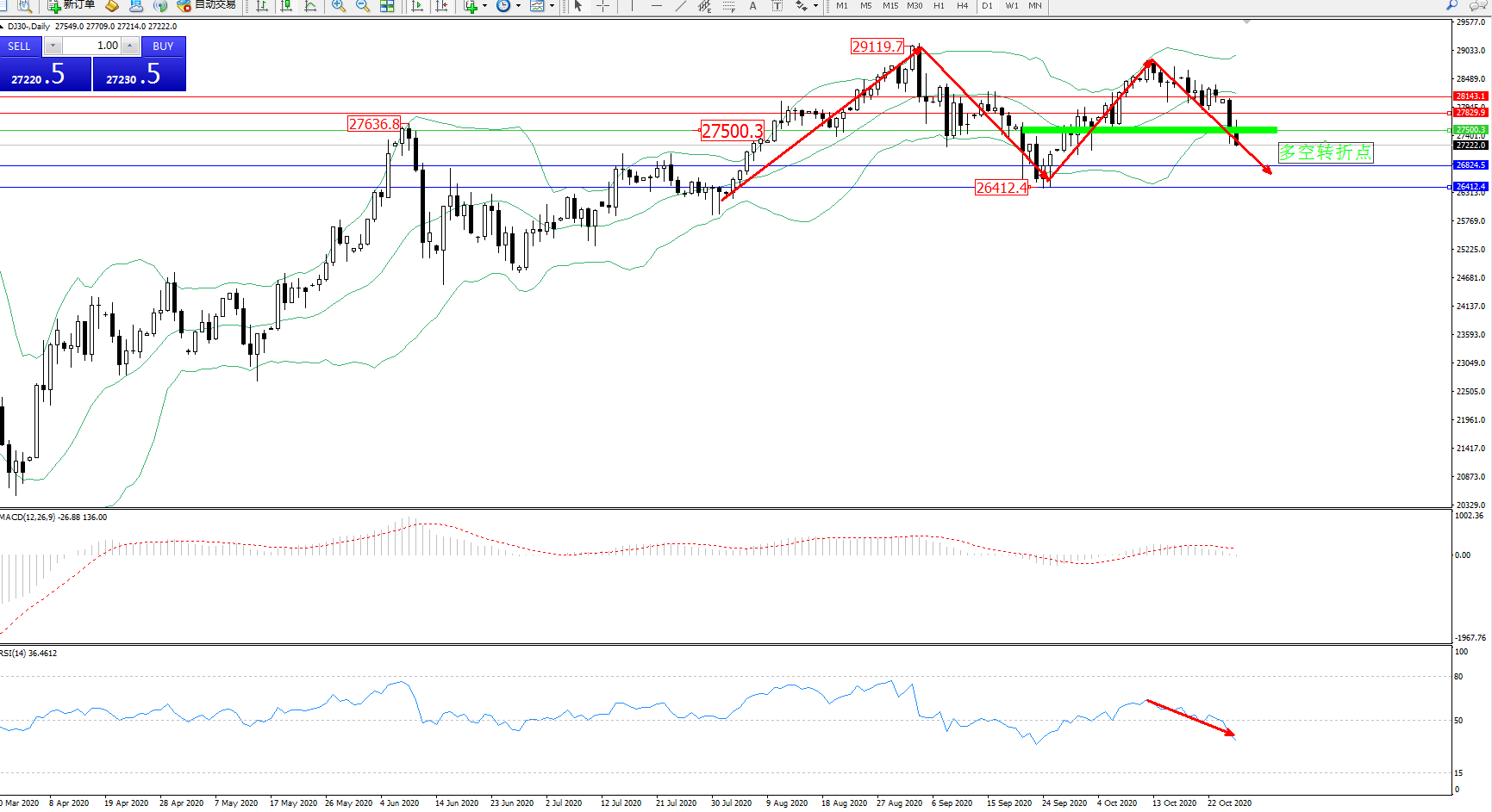 道琼斯指数10月27日(周二)收盘下跌222.20点,跌幅0.80%,报27463.19点。美股三大指数收盘涨跌不一,股市涨跌互现,科技板块上涨,投资者寻觅防疫封锁期内仍表现良好的公司,亚马逊、苹果等大型科技股走高。下跌股数量接近上涨股数量的四倍,银行板块首当其冲。美国股市最近几周走势受有关刺激法案的猜测牵引,但由于11月3日前通过刺激法案已经几无可能,投资者寻找新的显示美国企业健康状况的指标。民调显示,在即将到来的美国总统大选中,民主党人拜登的支持率明显领先于美国总统特朗普,但是在可能决定选举结果的那些摇摆州,竞争更加激烈。在美国、俄罗斯和法国的新冠肺炎感染人数都创下新纪录后,投资者显然非常谨慎。