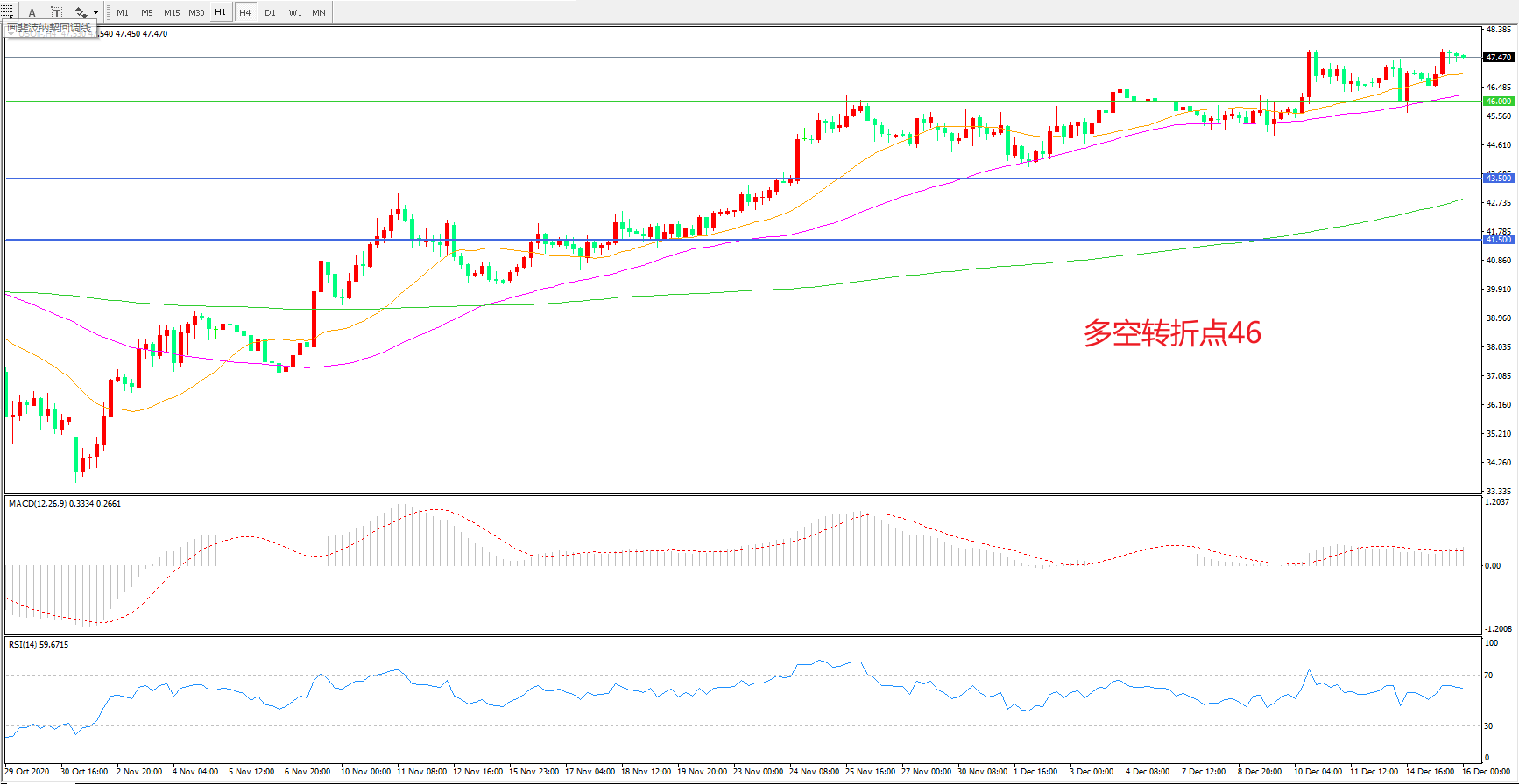 4小时图看,油价高位震荡后长阳拉升,整体表现较为强势,46美元形成有力支撑,均线系统呈多头排列,MACD红柱增加,RSI指标走平,日内震荡上行概率较大。