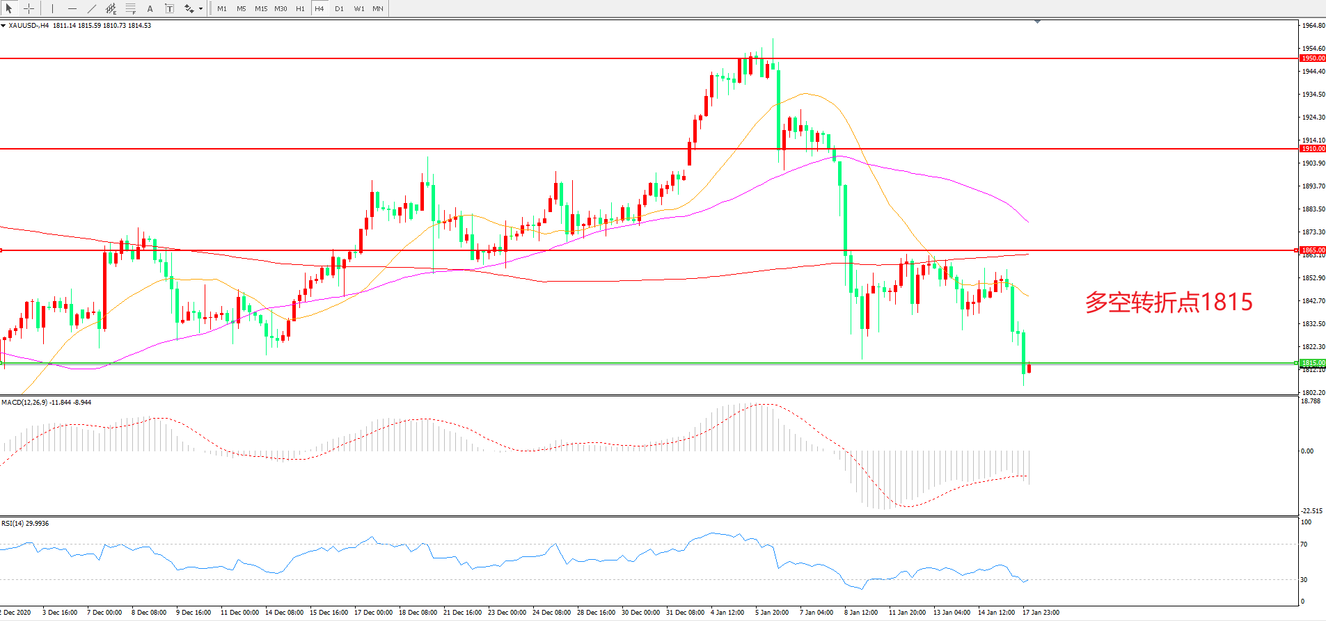 上周,美国当选总统拜登推出近1.9万亿规模的财政刺激提案,美联储主席鲍威尔发言强调延续宽松政策不变,10年期美债收益率创近10个月高点1.156%,对黄金产生相当负面的影响,周一(1月18日)早盘,现货黄金一分钟内下跌约20美元,最低至1804.39美元/盎司,目前回升至1814.72美元/盎司。