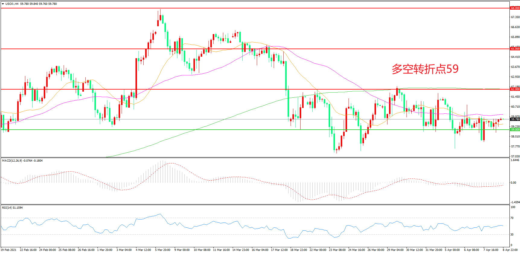 周四(4月8日),美国国务院举行发布会称,美国正准备取消对伊朗的制裁,以恢复伊核协议,市场权衡在经济复苏时伊朗增加供应的供需前景,油价盘中一度跌超1%,但由于全球复苏前景继续向好,多头情绪仍然支撑油价上行,美国WTI原油震荡回升,收报59.78美元/桶。