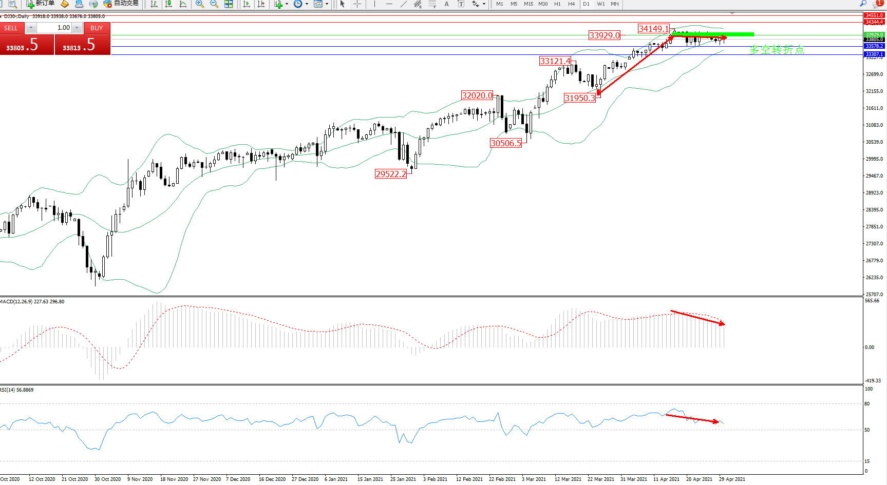 道琼斯指数4月30日(周五)收盘下跌182.28点,跌幅0.54%,报33878.08点;美股三大指数全部收跌,股市周五从创纪录高点下跌,因为公司业绩和经济数据显示出潜在的通胀压力,另外一位美联储官员也发表了鹰派言论。市场中过度冒险的迹象表明,现在是时候开始讨论缩减债券购买;这与美联储主席鲍威尔的观点形成分歧。受财政刺激措施提振,3月份美国的个人收入创下了1946年开始有月度记录以来的最高升幅,美联储用来确定其通胀目标的个人消费支出价格指数在3月份创出2018年以来的最大涨幅。因此“5月份卖出离场”的格言可能在许多投资者的脑海中浮现。但是,随着经济重启的步伐加快,敦促交易员为通货再膨胀交易再度兴起做准备。