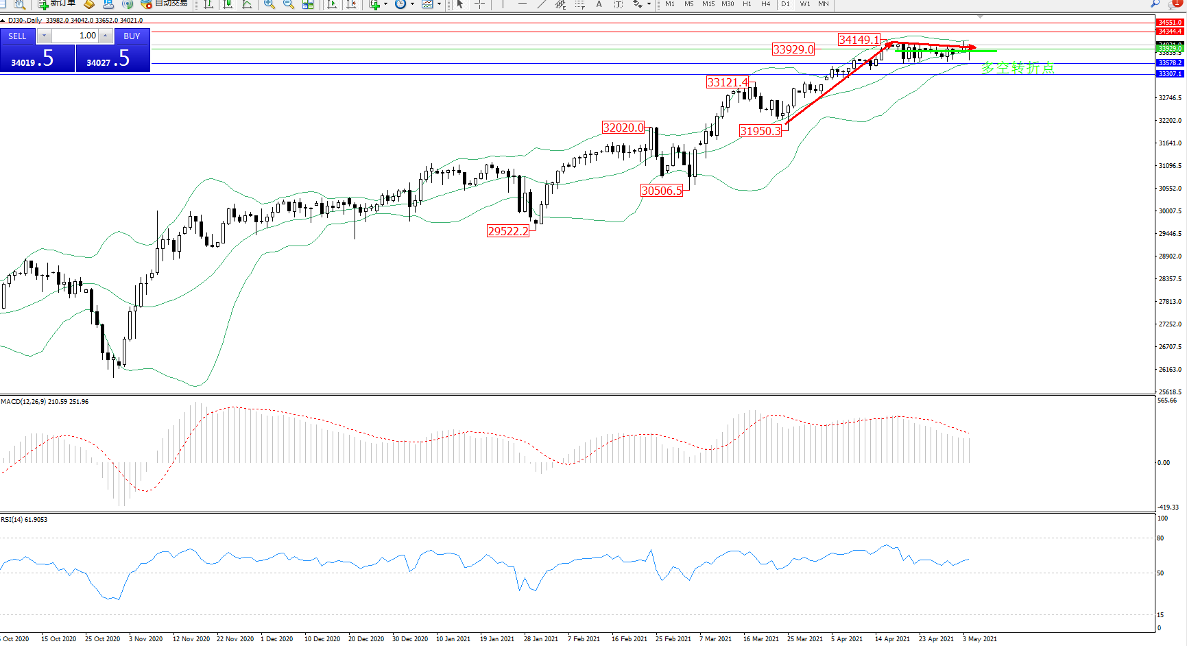 道琼斯指数DJ30—— 日K线图显示: