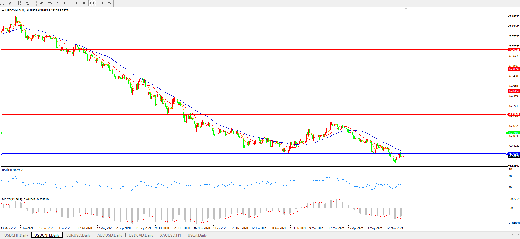 美元兑人民币USDCNH 日线图: