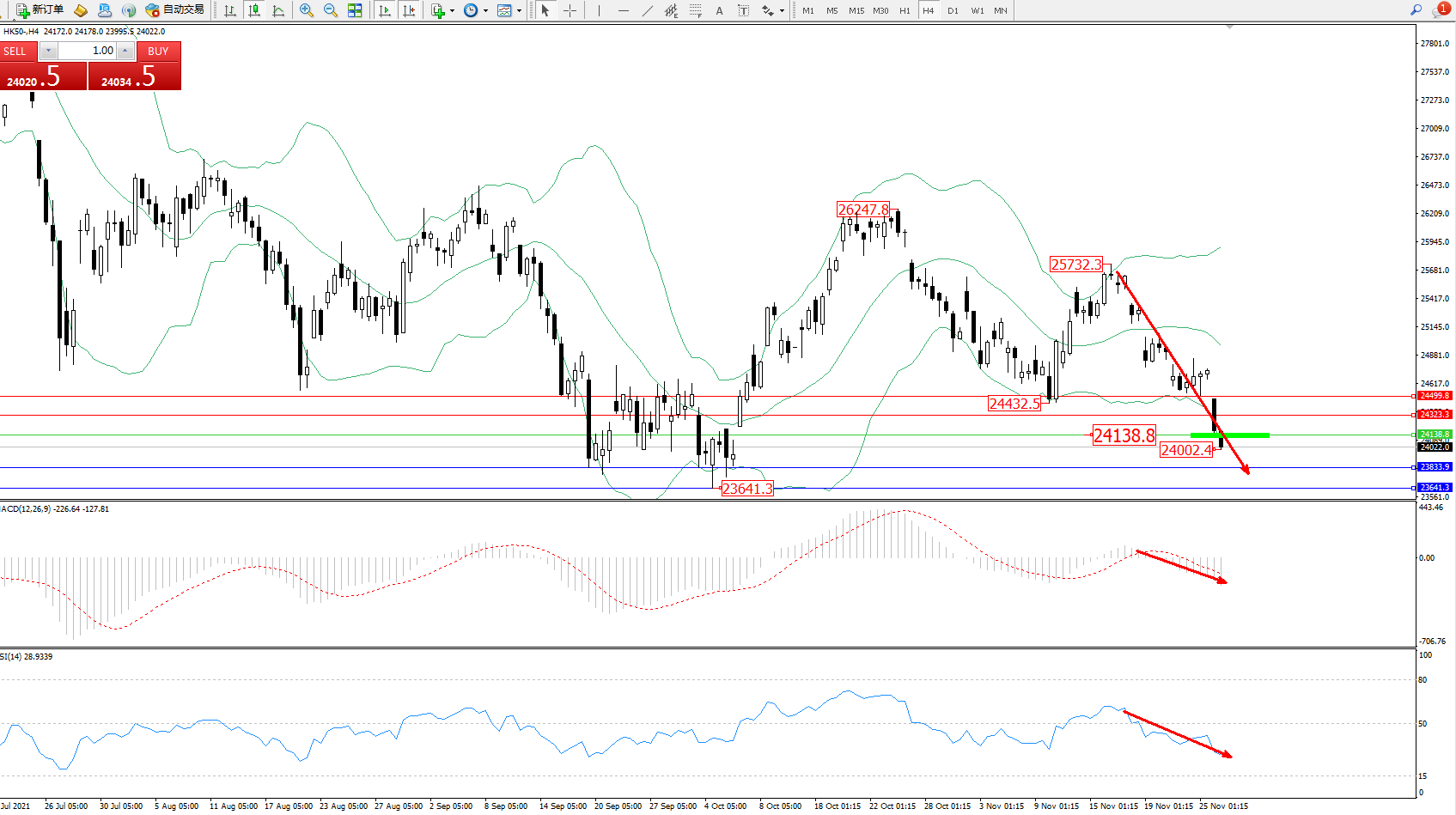 技术点评:空头动力延续布林带指标通道下轨附近持续震荡下行,低位抵达24002位置后有继续下行态势,布林带指标呈张口走势持续,短期有继续下探态势,MACD指标处于空头区域持续震荡下行,RSI指标处于空头区域维持整理不断下探中;