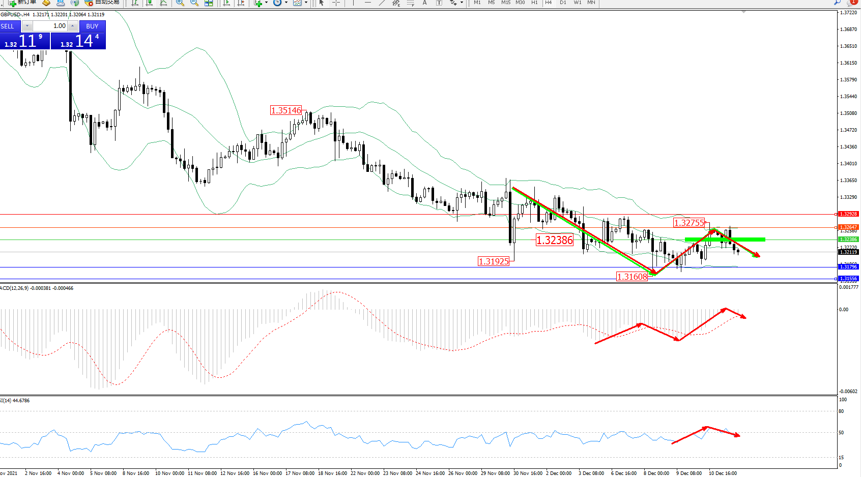技术点评:空头动力延续布林带指标通道中下轨区间持续震荡下行,低位抵达1.31608位置得到支撑反转整理上移,触及布林带指标上轨1.32755位置后遇阻回撤,短期空头动力有继续向下移动迹象,布林带指标呈收口走势持续平移中,MACD指标处于0轴线附近弱势徘徊,RSI指标处于50均衡线附近持续整理;