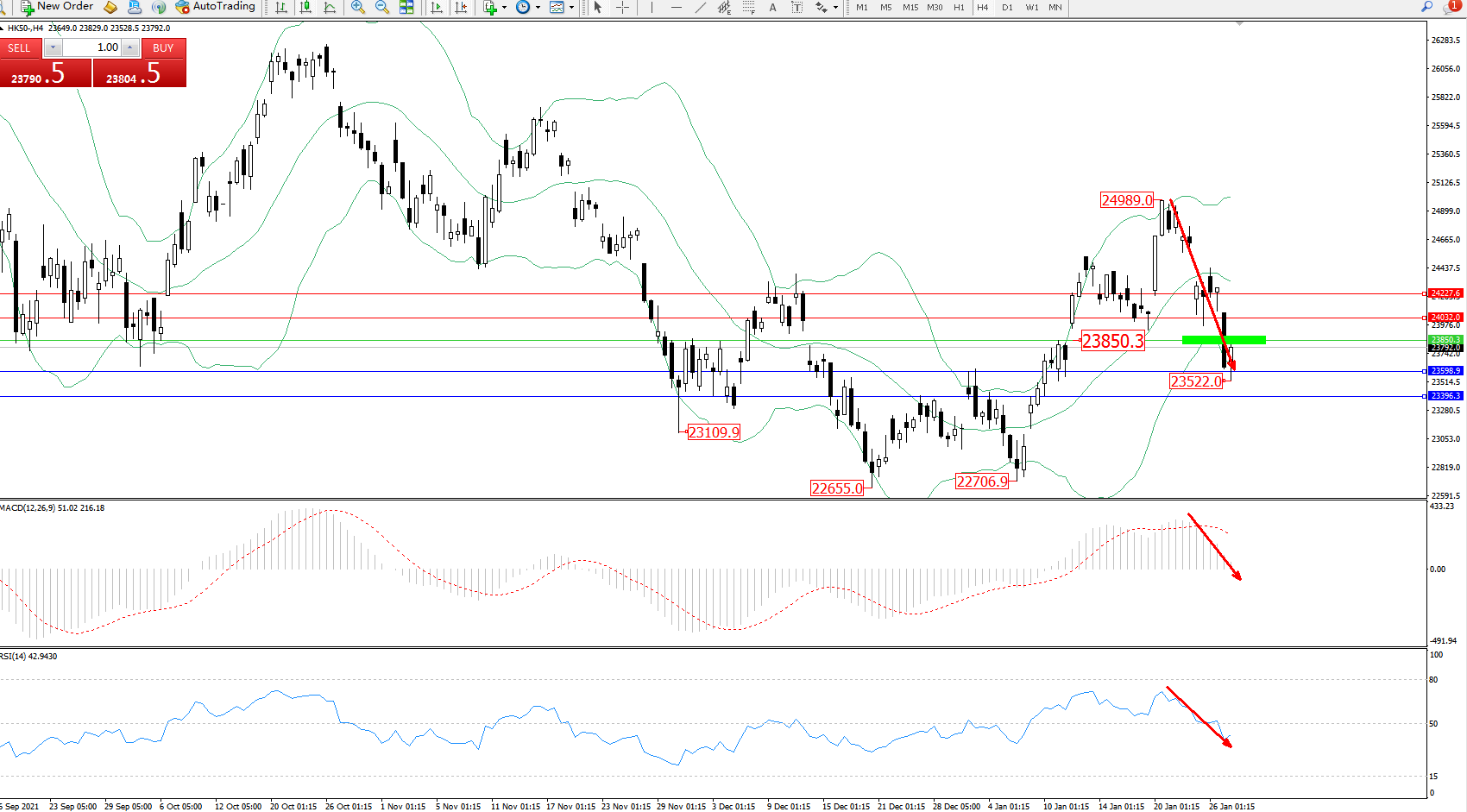 香港恒生指数1月27日(周四)收盘下跌482.9点,跌幅1.99%,报23807.0点;昨日止跌的港股再现大跌行情,恒指失守24000点,恒生科技指数大幅收跌3.81%,逼近历史低位。行业板块集体下挫,市场情绪再度降至冰点。大型科技股齐挫,阿里巴巴跌超7%,美团跌6.9%,小米跌5.5%,快手、网易、百度跌超4%,腾讯跌超2%;网传职教去资本化,教育类股现抛售式下跌行情,国家市场监督管理总局价格监督检查和反不正当竞争局局长袁喜禄表示,下一步,将加快完善反不正当竞争法律规则,不断健全多层次的竞争监管规则体系,明确规则底线,为市场主体提供一个明确的预期。围绕平台经济、科技创新、信息安全、民生保障等重点领域,加强反垄断和反不正当竞争监管执法,切实维护市场公平竞争秩序。同时,进一步健全公平竞争审查机制,加强滥用行政权力排除、限制竞争执法,坚决破除地方保护和市场分割,维护全国统一大市场。