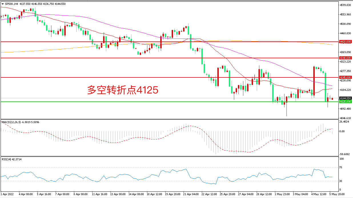 周四(5月5日),投资者持续消化美联储以22年来最大幅度加息和马上开启缩表的信息,高估值的科技股和成长股领跌,标普500长阴下挫,收报4145.00点。市场在议息会议后发出的信息清晰且响亮——加息有引发经济衰退的风险,从美联储70年代的抗通胀史来看,美股多头前路或更艰难,重点关注晚间公布的非农就业数据表现。
