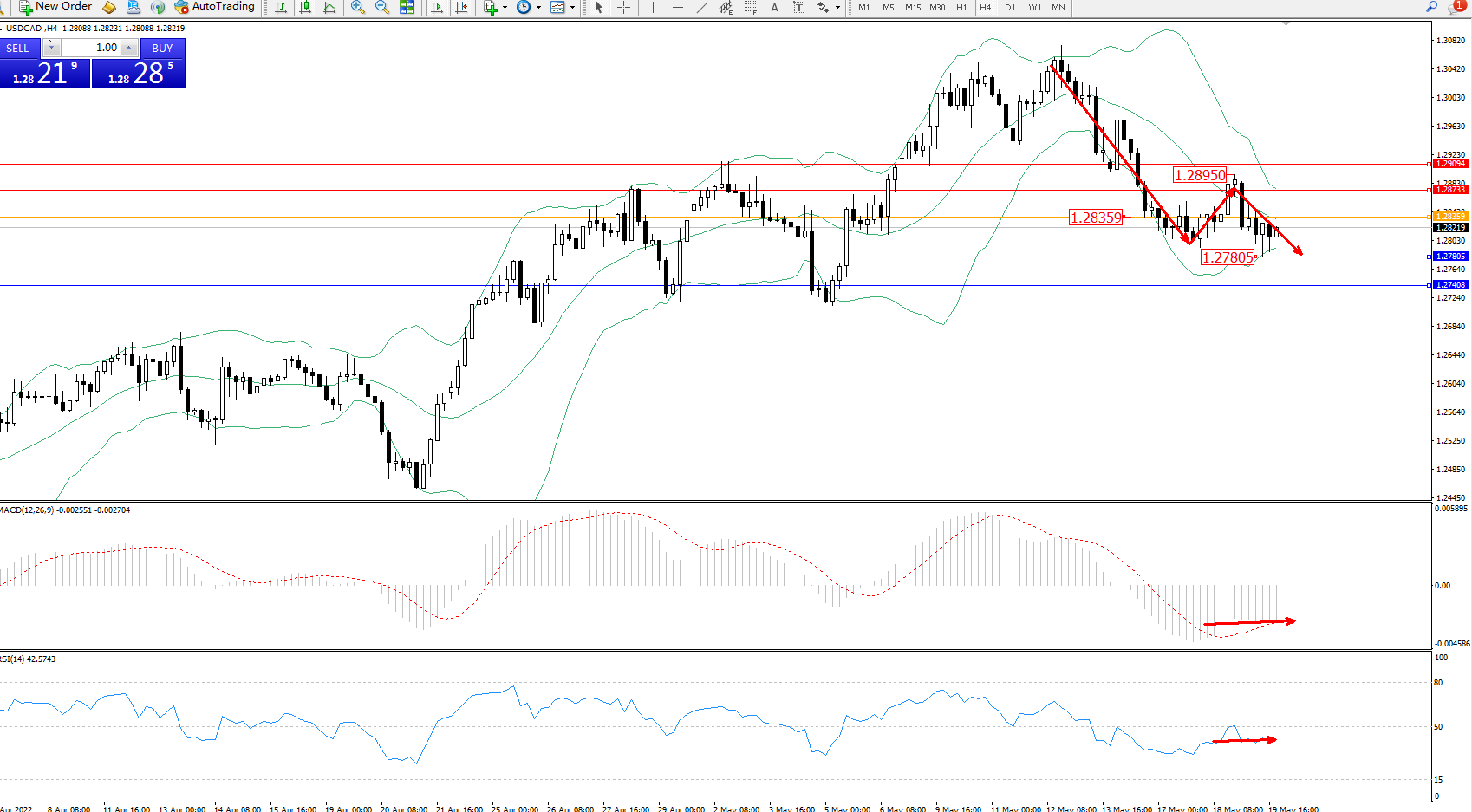 技术点评:高位空头动动力延续布林带指标通道中下轨区间持续震荡下行,低位抵达1.27805附近窄幅整理平移,空头动力有继续弱势整理向下移动迹象,布林带指标呈收口走势持续中,MACD指标处于0轴线下方空头区域维持整理,RSI指标处于50均衡线下侧维持弱势徘徊;