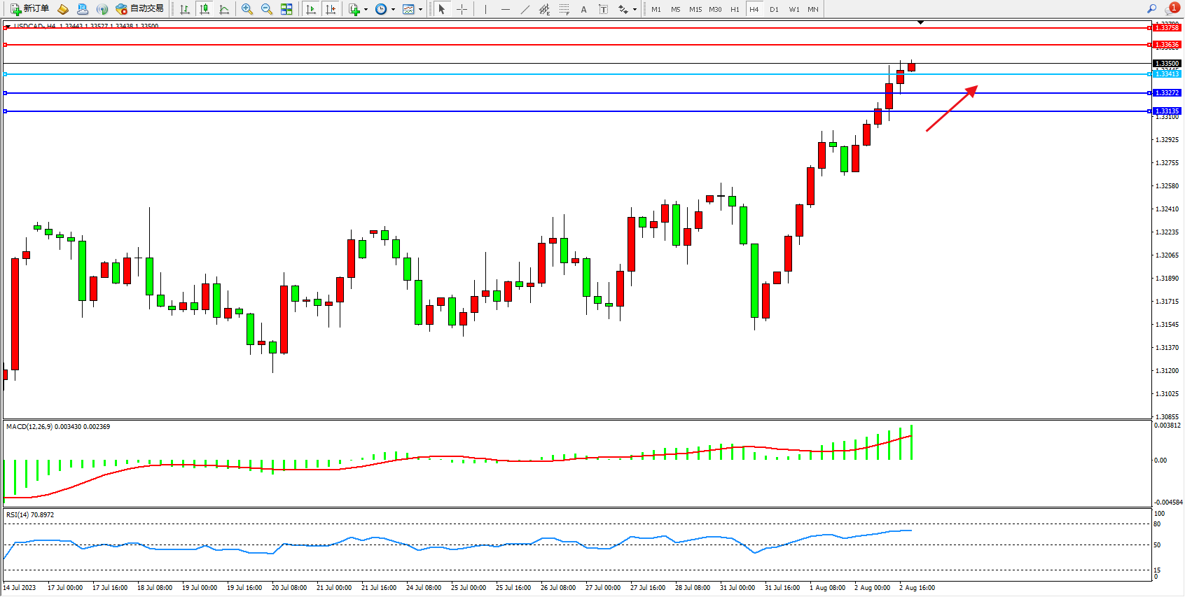4小时图看:高位多头动力强势震荡上移,市场看涨情绪笼罩,短期有继续向上移动态势,MACD指标处于多头区域不断上扬,RSI指标处于多头区域上移;